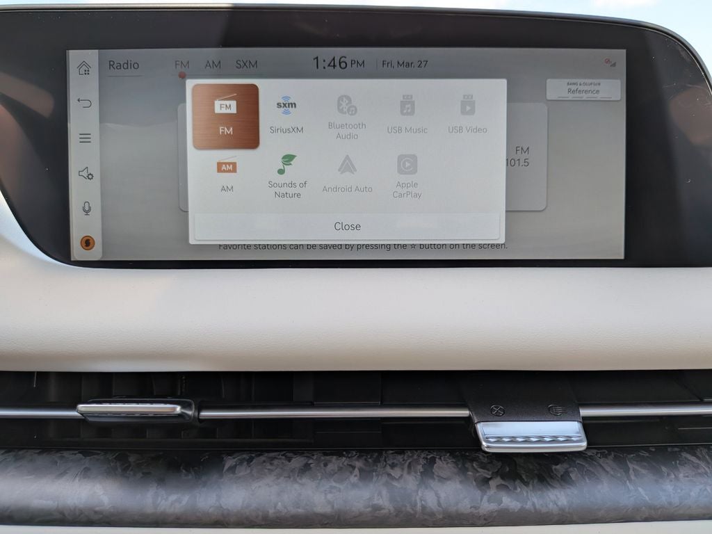 - Radio: AM/FM Bang & Olufsen 3D Prem Audio System -inc: HD radio, navigation system w/12.3" HD screen, SiriusXM radio w/90-day subscription (not available in AK & HI), wireless Apple CarPlay and Android Auto, 23 speakers, 100W x 14 channel (1400W, max, equivalent output), Genesis Connected Services, 300W auxiliary amplifier for 3D sound, Bluetooth® hands-free phone and audio streaming system, USB connectivity and Wi-Fi hotspot