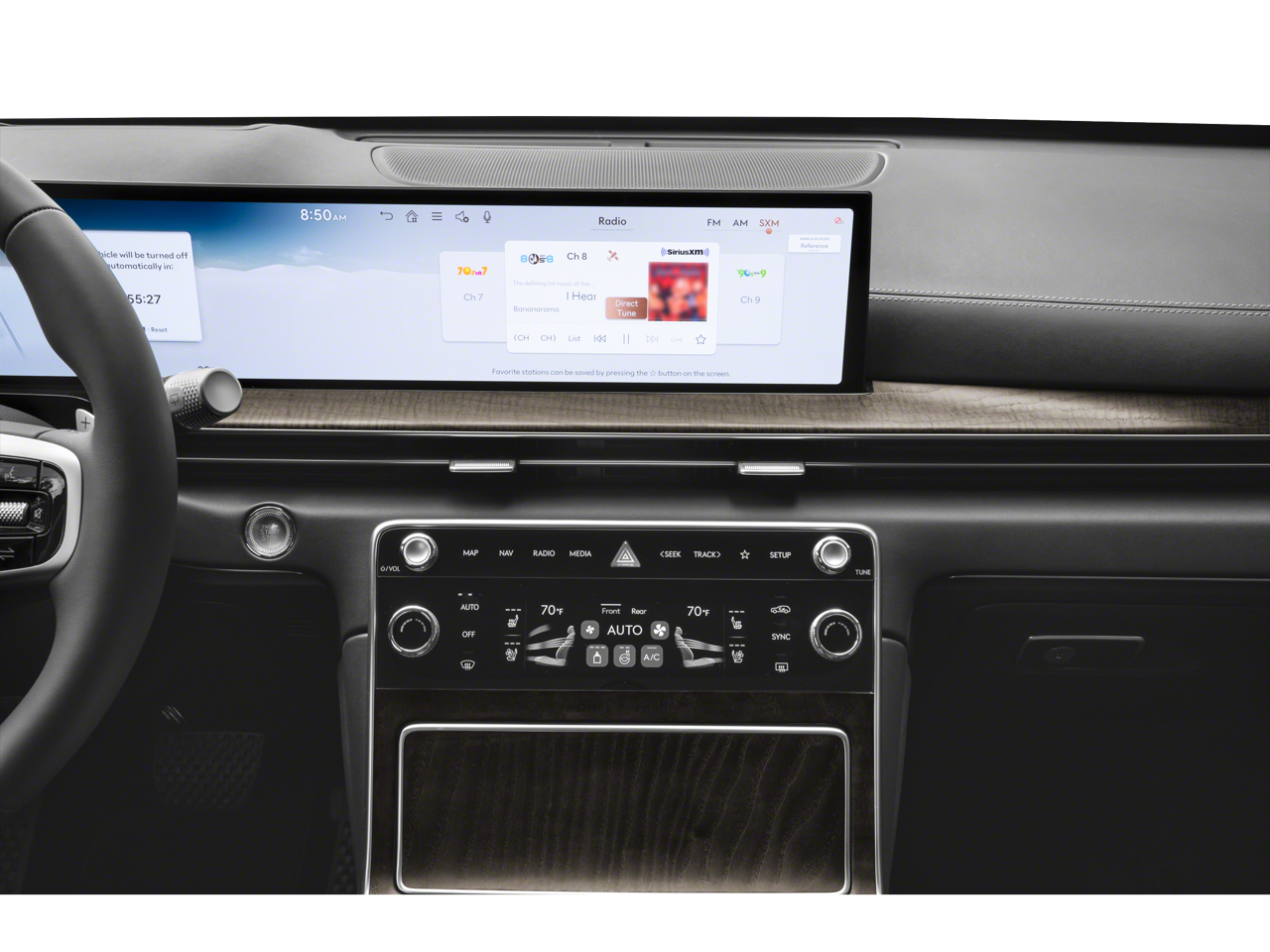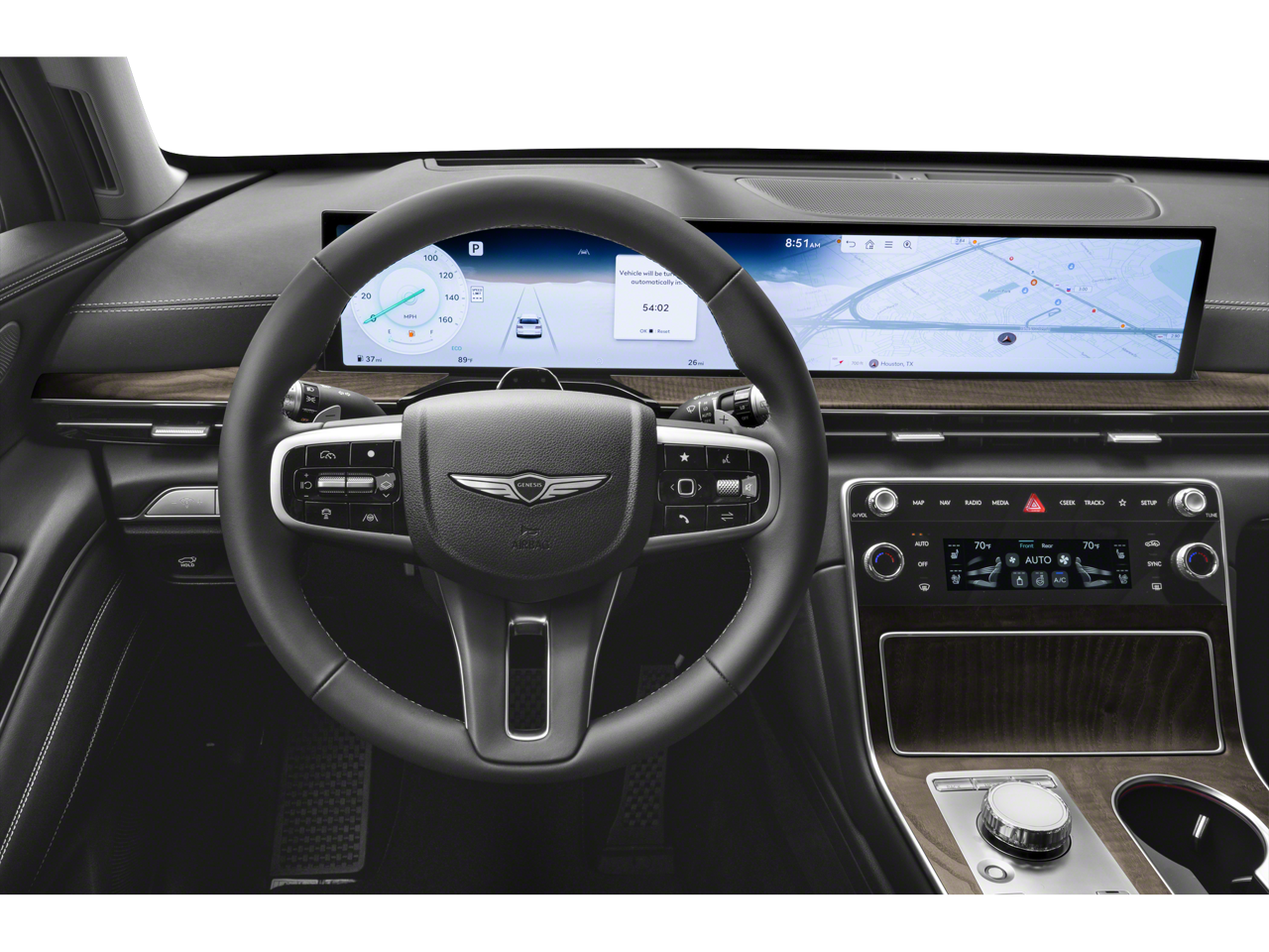 - Radio: AM/FM/HD Radio -inc: premium audio w/12 speakers, 27" integrated OLED instrument cluster and navigation system, SiriusXM Radio w/90-day subscription (not available in AK or HI), cloud connected platform (cloud profiles, connected routing, dynamic voice recognition, OTA updates), wireless Apple CarPlay, wireless Android Auto, Bluetooth® hands-free phone system w/audio streaming, wireless phone charger, Wi-Fi hotspot, steering wheel controls, USB and Genesis Connected Services