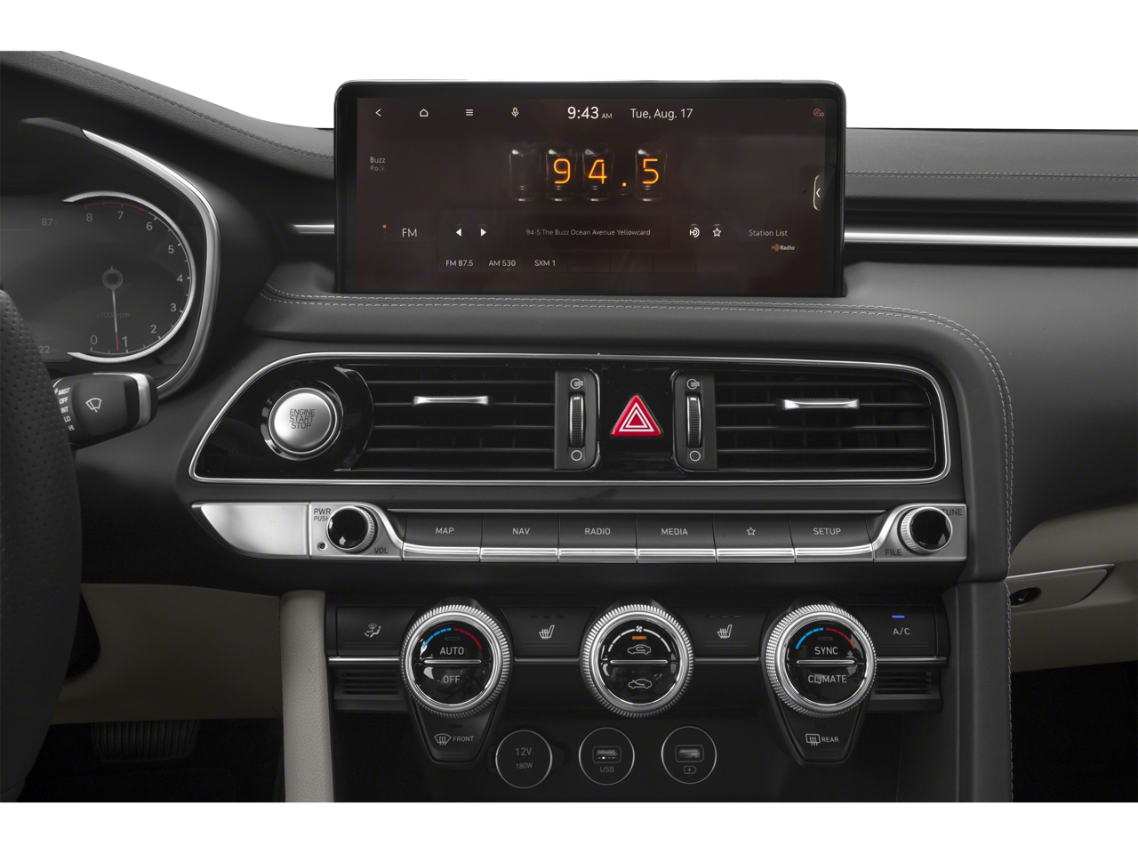 - Radio: AM/FM/SiriusXM/HD Audio System -inc: 6 speakers including subwoofer, 6 channel internal amplifier, speed-sensing auto volume control, 5th generation navigation system w/10.25" touchscreen, dynamic voice recognition, connected routing, over the air updates, Android Auto and Apple CarPlay, Bluetooth® hands-free phone system, steering wheel audio, cruise and phone controls, USB front and Genesis Connected Services